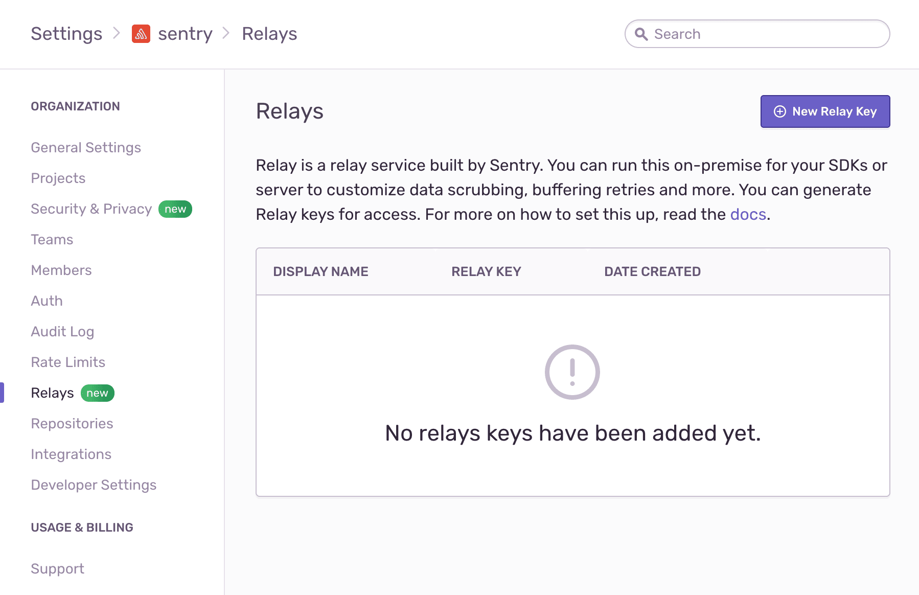 2. Click on Settings in the main navigation for Sentry, then select Relays.