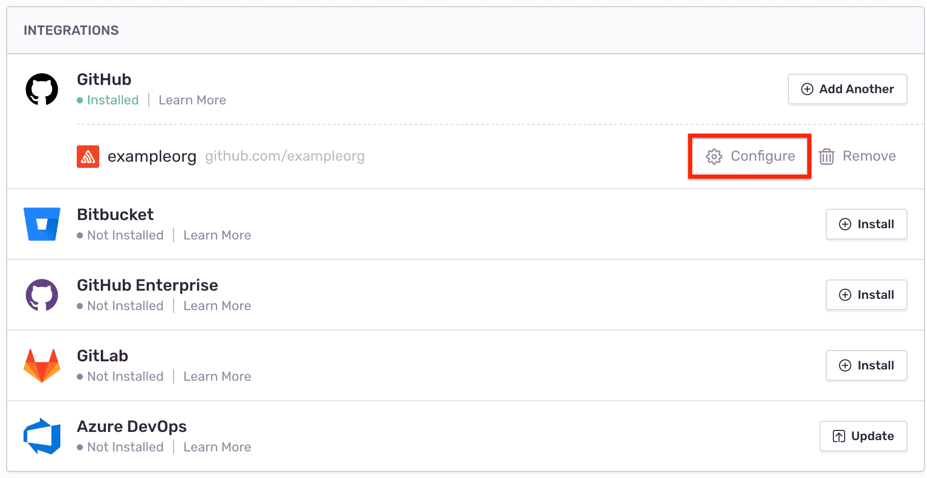 1. Install the applicable integration. The available integrations are listed under your Organization Settings > Integrations.